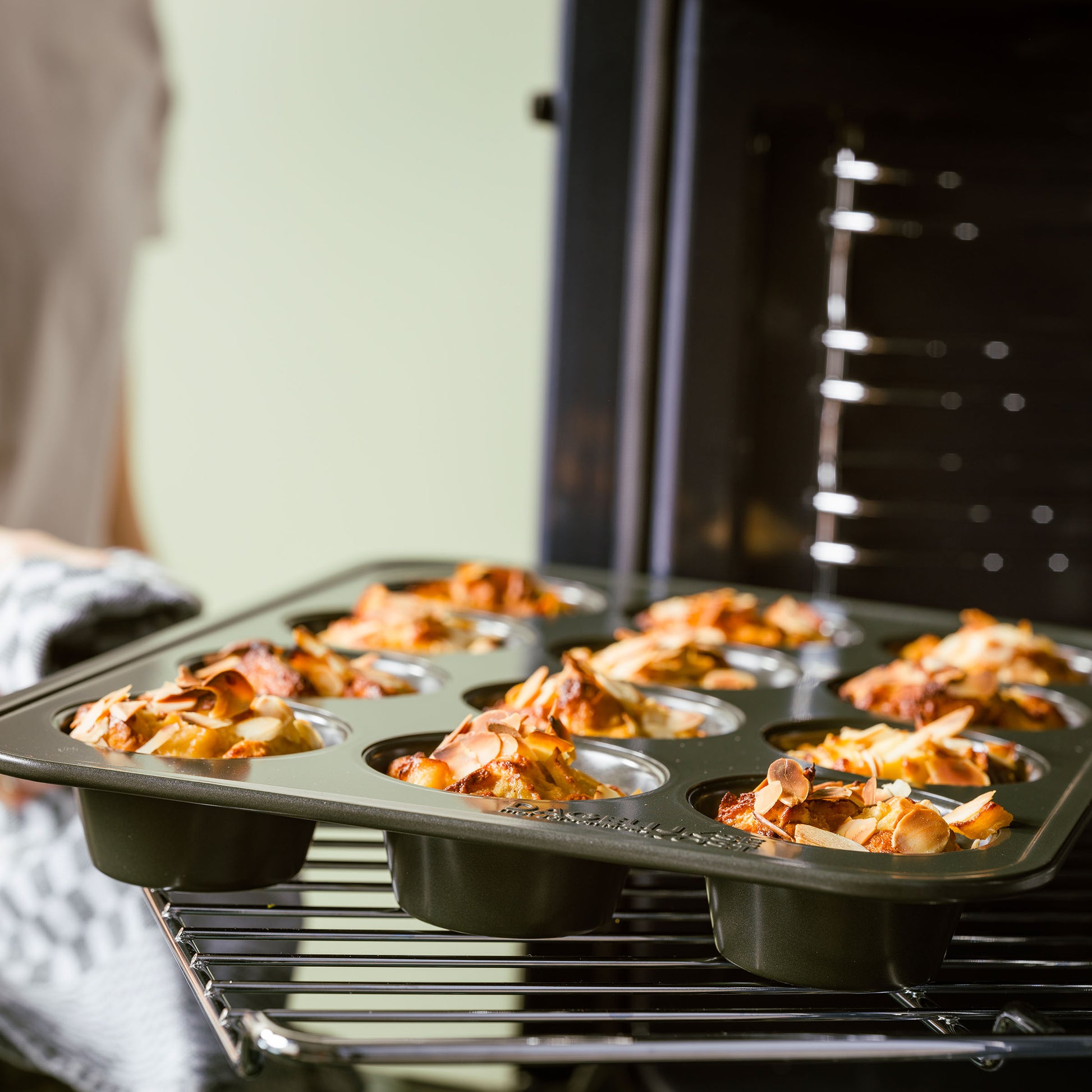 Cuisiner devient encore plus amusant avec les moules Dagelijkse kost ! Fabriqués en tôle d'acier aluminisée de haute qualité, ils sont particulièrement robustes et chauffent uniformément. Vous êtes ainsi assuré d'obtenir des résultats de cuisson parfaits. Grâce au revêtement antiadhésif intérieur sans PFAS, vos pâtisseries ne collent pas et conservent leur forme. Autre avantage : le nettoyage est un jeu d'enfant ! Leur élégant design vert olive est également un véritable atout. Beau, durable et facile !