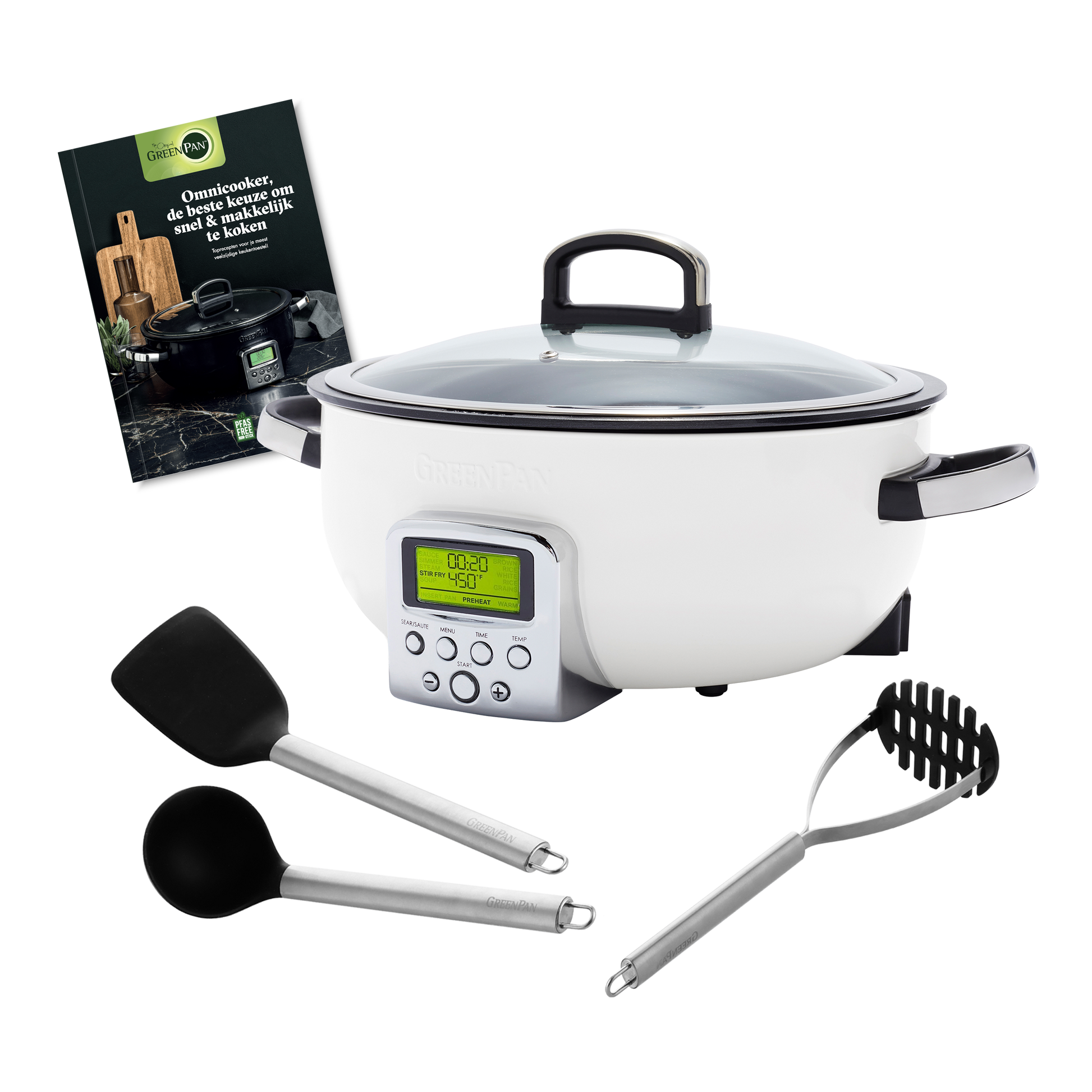 Inclusief: een kookboek vol inspiratie en een utensil set met opscheplepel, spatel en stamper!