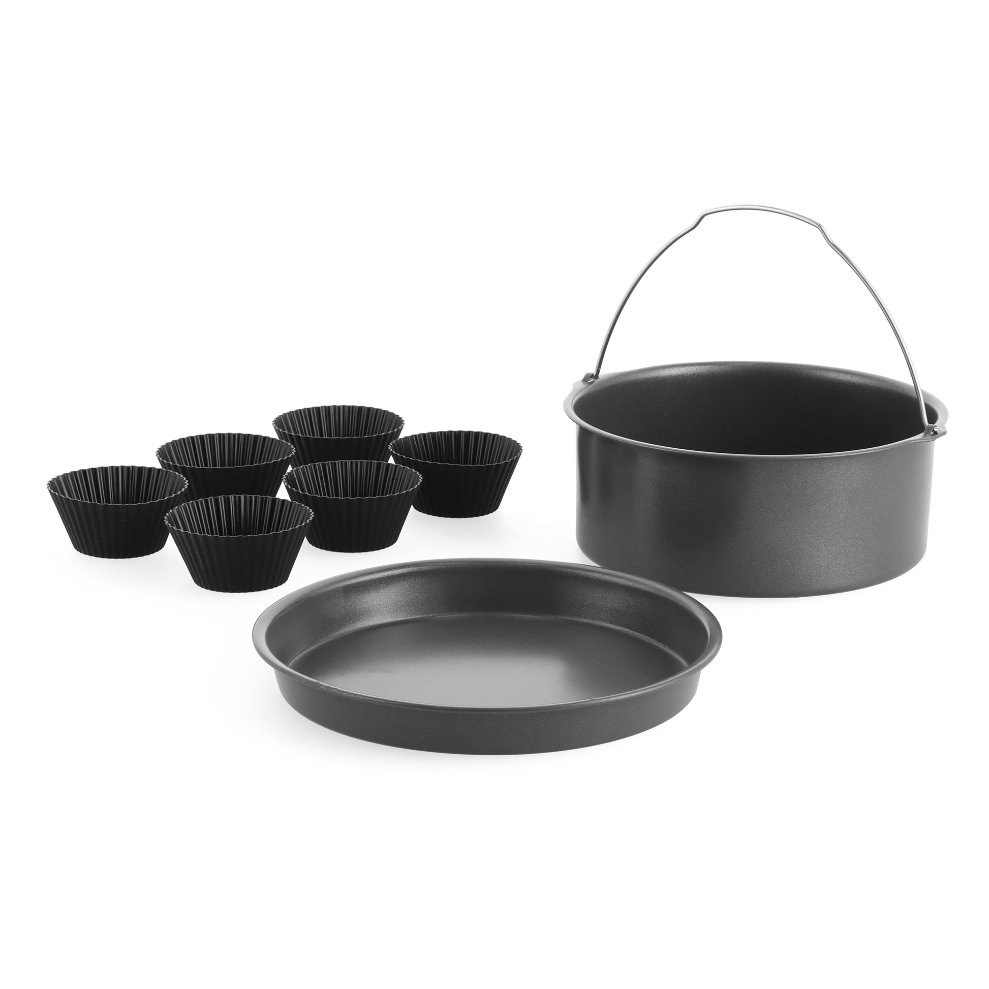 De quiche- en pizzavorm, en de bakvorm hebben een geavanceerde PFAS-VRIJE keramische antiaanbaklaag. De muffinvormen zijn gemaakt van gladde silicone. Deze 8-delige set is geschikt voor alle airfryermanden met een minimale inhoud van 6 liter.